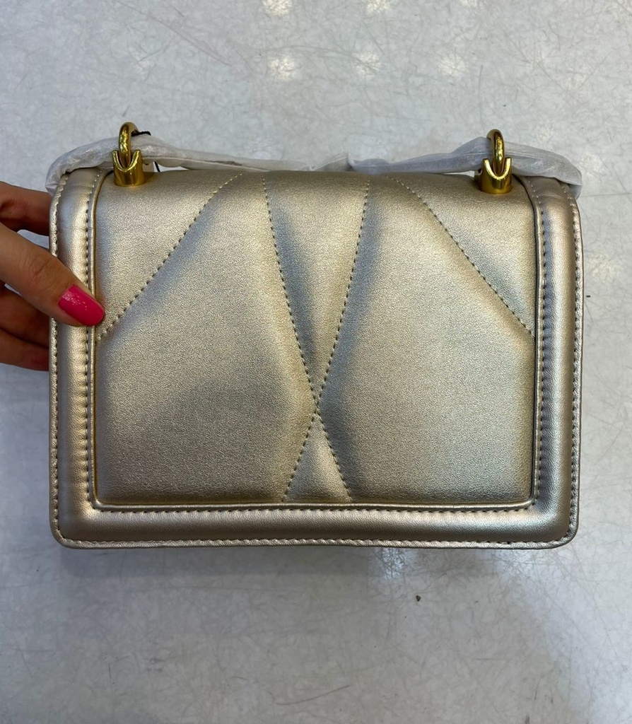 Bolsa transversal Devotion Matelassê, ferragem Sacred Heart exclusiva, ferragem dourada, fecho Sacred Heart exclusivo, parte superior dobrável com fecho magnético, alça de ombro em couro com corrente ajustável e compartimento principal.