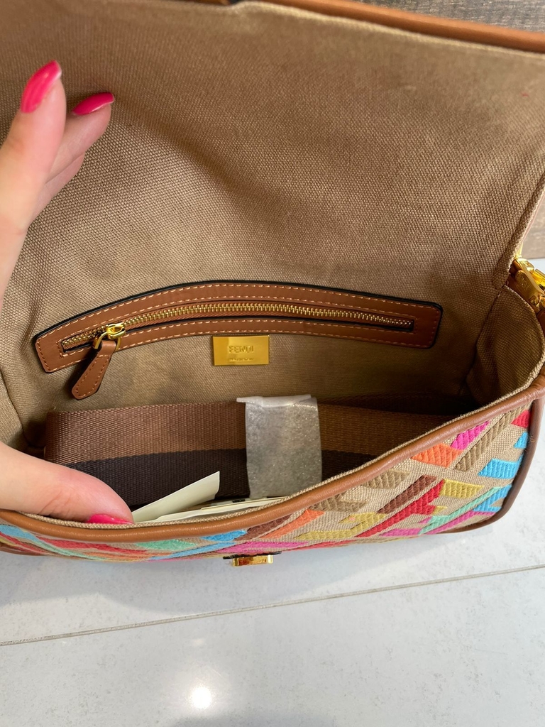 Icônica bolsa Baguette média feita de lona marrom com um motivo FF Multicolorido em relevo criado com bordados em tons sobre tons, com acabamento em couro marrom escuro e adornado com um fecho FF.