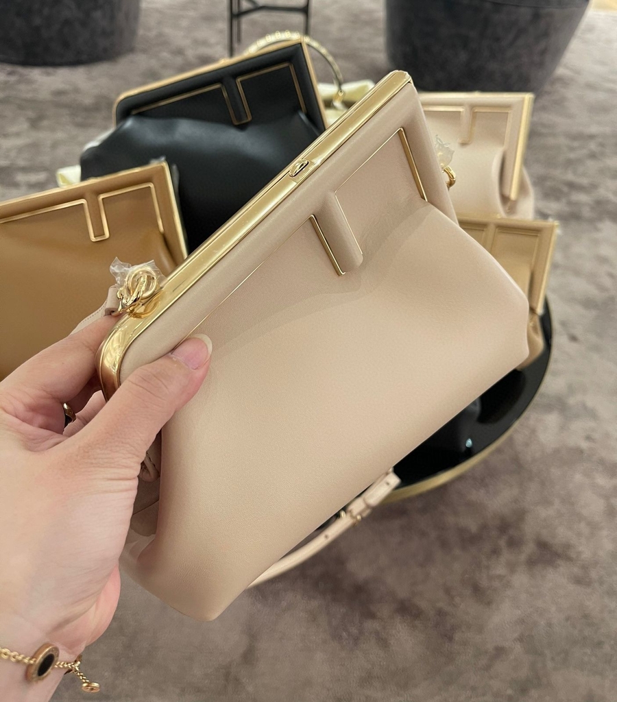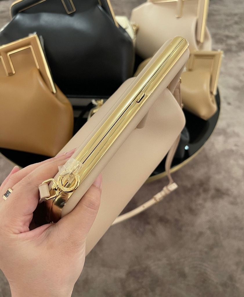 Pequena Fendi First bolsa feita de couro macio cor bege, com fecho macro F de metal encadernado em couro tom sobre tom. Apresentando um compartimento interior forrado em tecido com o icônico motivo FF, puxe pontos de fixação e utensílios de metal com acabamento dourado.