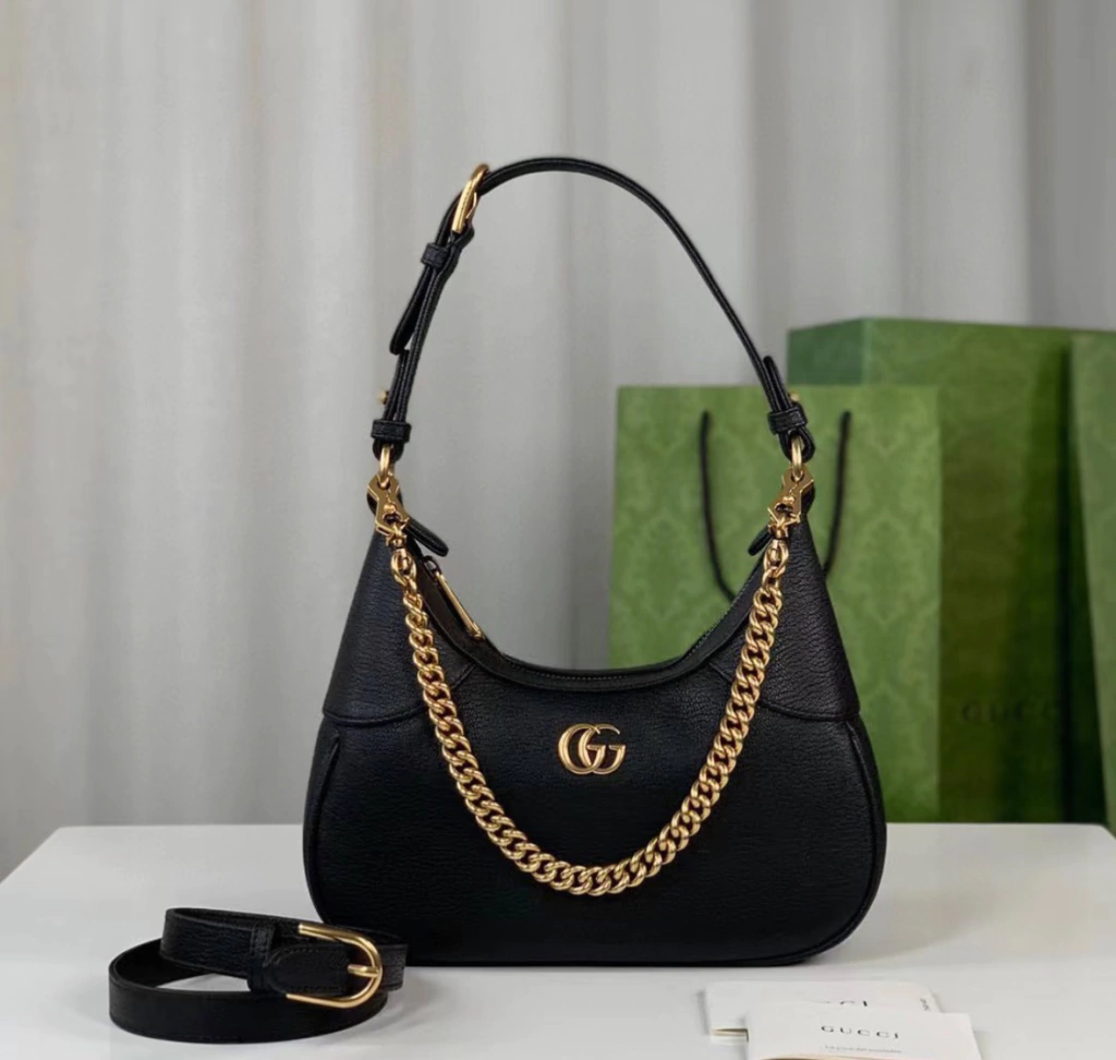 Esta nova pequena bolsa de ombro em forma de meia-lua foi inspirada nos arquivos da Maison, é confeccionada em couro macio preto e apresenta o emblema Double G, um código originalmente introduzido na década de 1970. Incorporando a noção de versatilidade, a bolsa é enriquecida com duas alças de ombro, uma feita em couro e a outra com o reconhecível design de corrente dourada da Gucci.