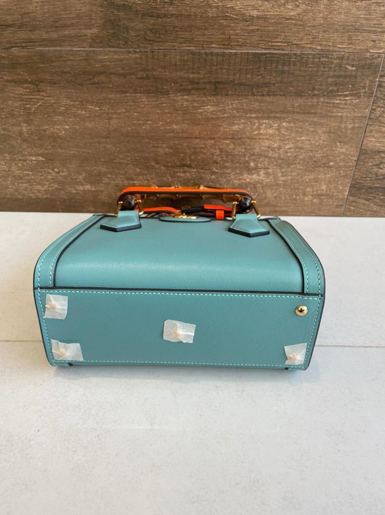 A pequena Bolsa Diana é definida por suas alças de bambu e hardware Double G. Feito em couro azul, o acessório é ainda mais acentuado por duas faixas de neon, uma referência lúdica às faixas usadas para manter os cabos em forma.