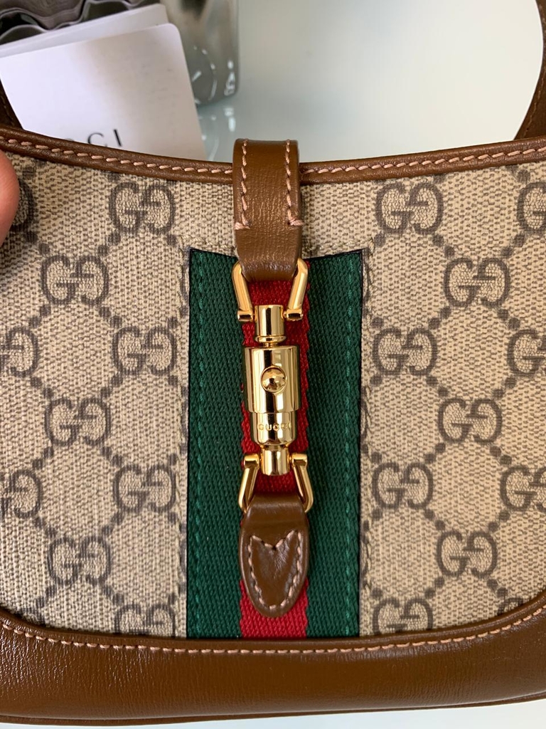A bolsa Jackie em um tamanho mini , a forma reconhecível é apresentada em tela GG Supreme e aprimorada com uma alça de ombro destacável adicional. Presa à bolsa com um fecho de fivela, a segunda alça adiciona uma sensação , proporcionando novas maneiras de usar - da alça superior, ombro e corpo transversal.