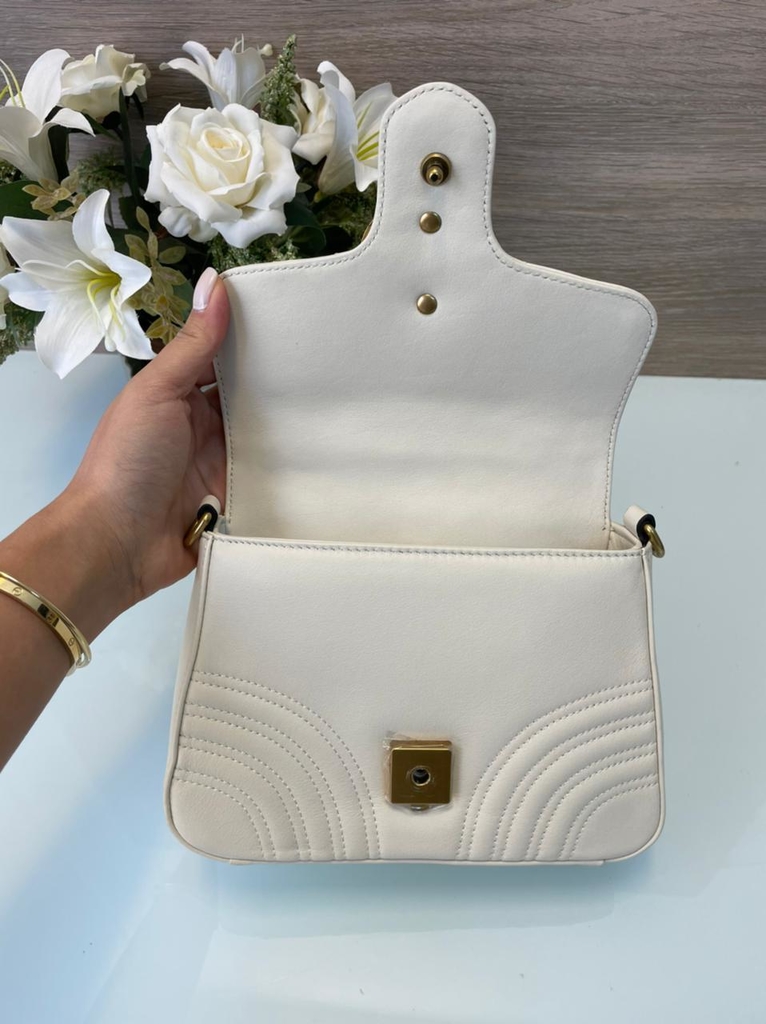 A mini bolsa GG Marmont com alça superior tem um formato suavemente estruturado e um fechamento de aba superdimensionado com hardware Double G. Equipado com uma alça superior em couro e alça de ombro em corrente, confeccionada em couro matelassé chevron com um coração nas costas.