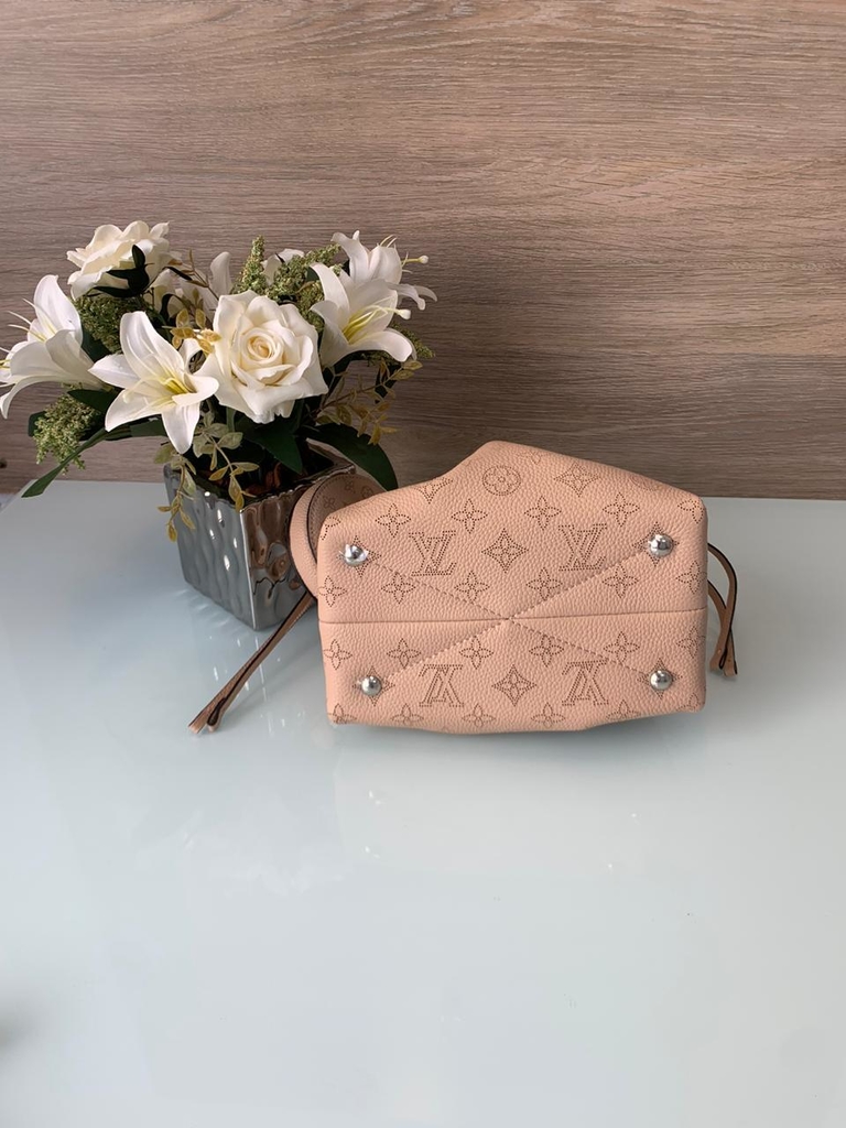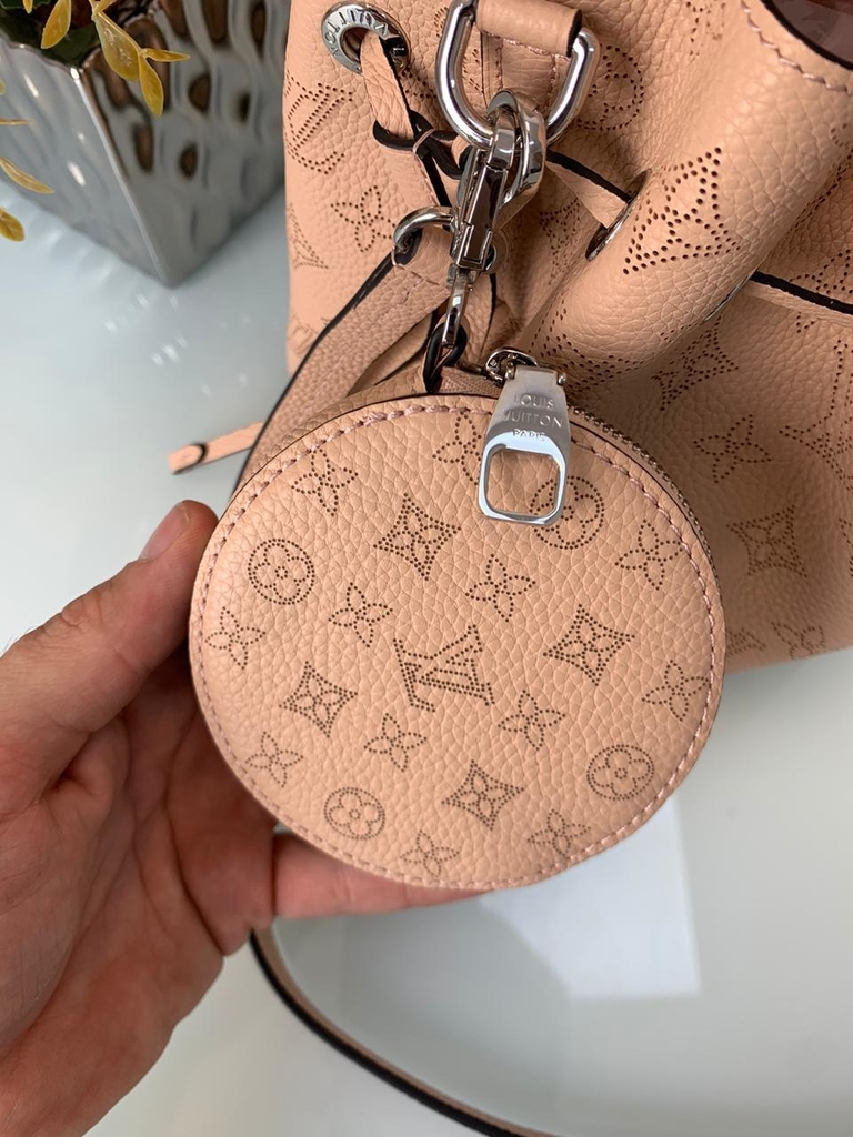 Louis Vuitton Bella em couro légítimo com seu padrão Monogram perfurado. Seu tamanho pequeno e seu porta moedas redondo, com uma versão em miniatura do padrão Monogram perfurado de um lado, tornam-na moderna, desejável e na moda. A sofisticada alça mista de couro e metal anexada a uma alça de couro removível traz versatilidade em diversas formas de usar.