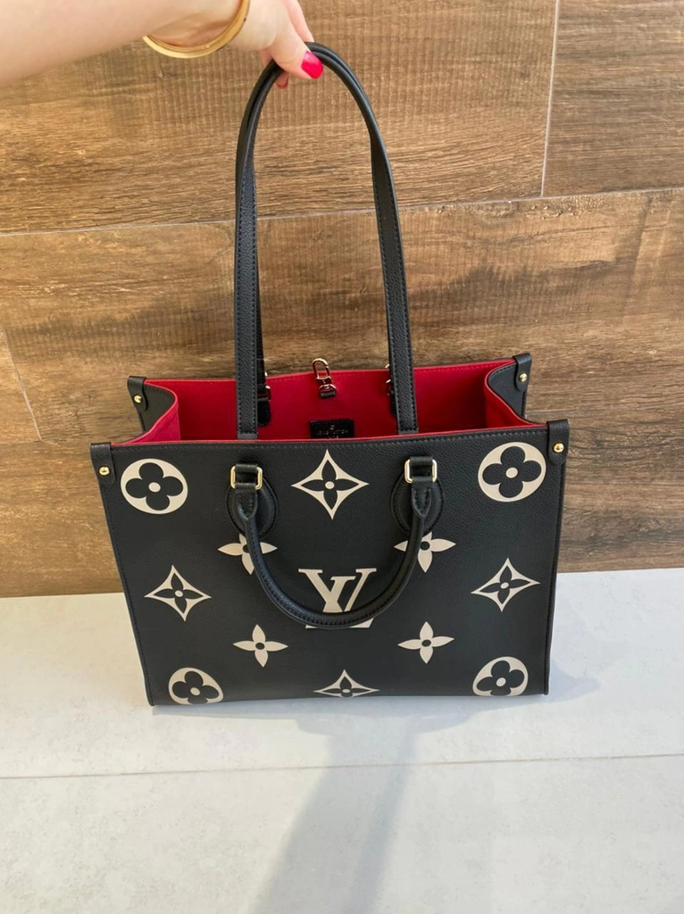A bolsa tote OnTheGo MM em tamanho médio traz dois conjuntos de alças, longas e curtas, para carregar na mão ou no ombro. Em couro granulado e maleável, ela apresenta o padrão Monogram Medium estampado e gravado em alto-relevo. O interior espaçoso, que comporta um laptop e outros itens de trabalho, faz dela uma bolsa versátil .