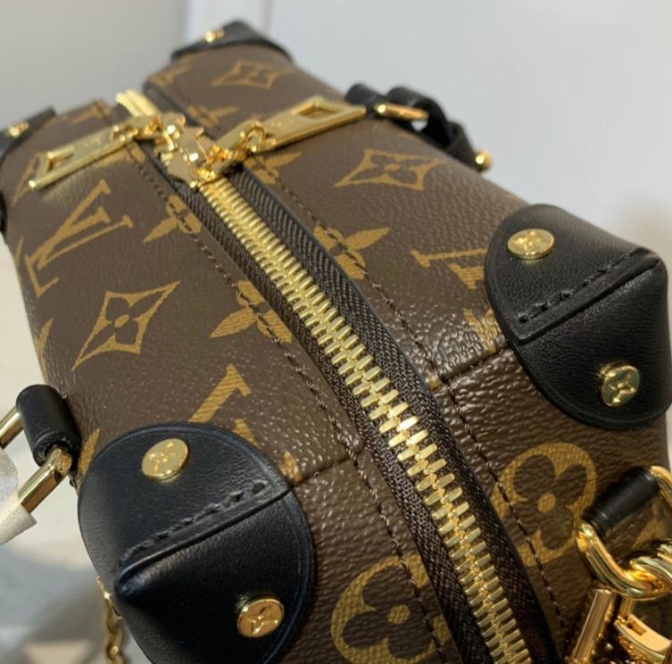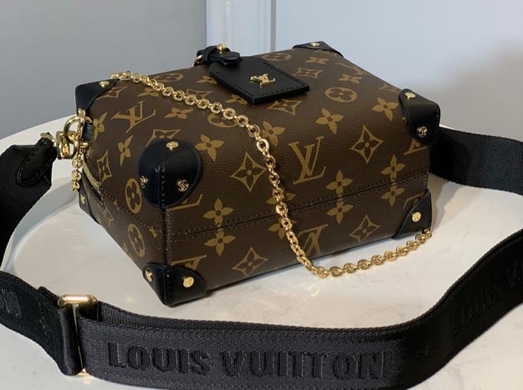 Petite Malle Souple bolsa em canvas Monogram, os cantos de couro Preto rebitados e a tag de identificação de couro evocam o legado da Louis Vuitton como fabricante de baús. Uma corrente náutica dourada e uma larga alça removível bordada com a Louis Vuitton Malletier trazem o estilo do momento.