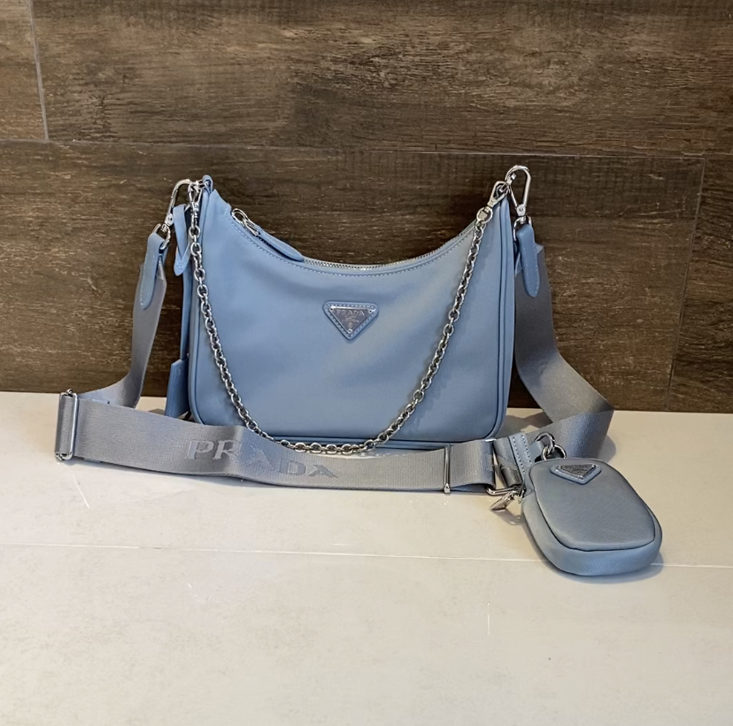 Esta bolsa de ombro em nylon feminina com detalhes contemporâneos é decorada com um acabamento em couro Saffiano.