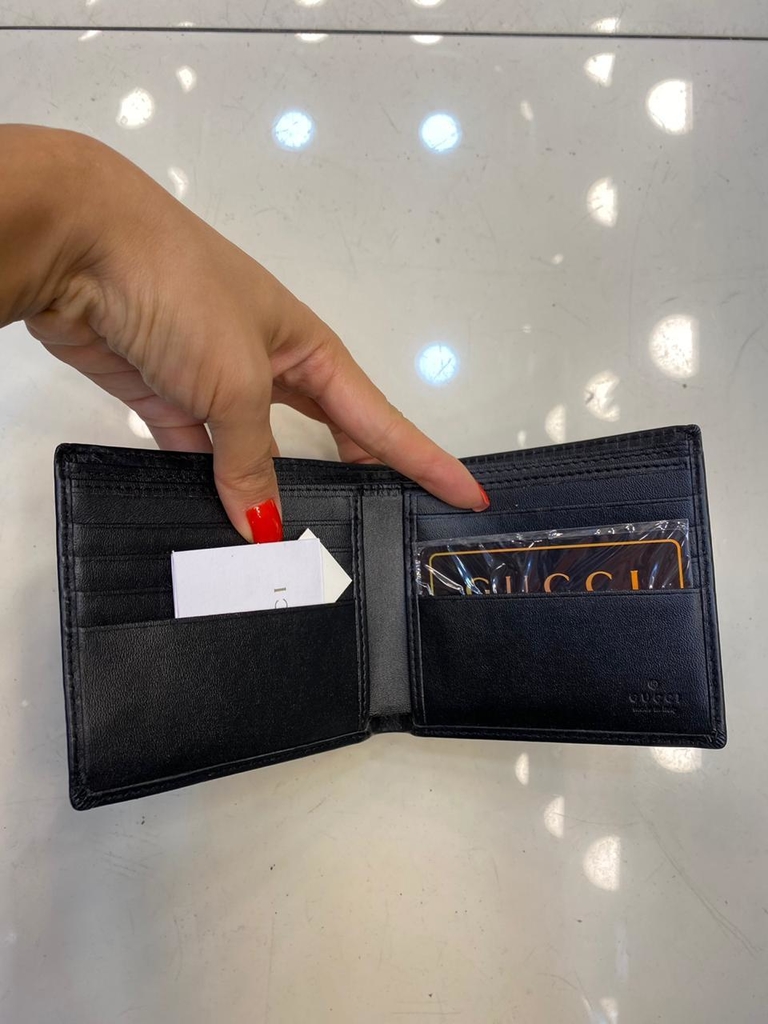 Carteira Gucci Masculina , em Couro Gucci Signature, que recebe uma impressão definida com uma estrutura sólida através de hot stamping , Preta , com GG em metal dourado no canto .