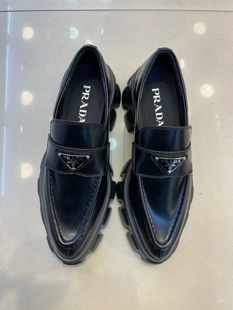 Caracterizado por seu design masculino, este mocassim em couro escovado entra na imaginação feminina com um estilo mais pesado e detalhes refinados. Sua sola tratorada grossa define o produto valorizado com o logotipo triangular esmaltado.