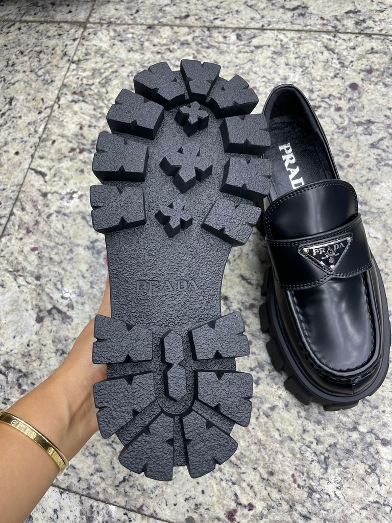 Exclusivo e ousado, este calçado enfatiza o conceito de dualidade, essencial na estética da marca. A sola maxi modernista com design monolítico exclusivo dialoga com o cabedal em couro escovado, de visual precioso e acabamento polido. Uma alma híbrida, mas harmoniosa, caracteriza a linha Monolith que combina imagens diametralmente opostas para criar uma silhueta atemporal. O mocassim é decorado com o icônico logotipo triangular em metal esmaltado.