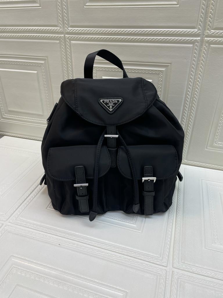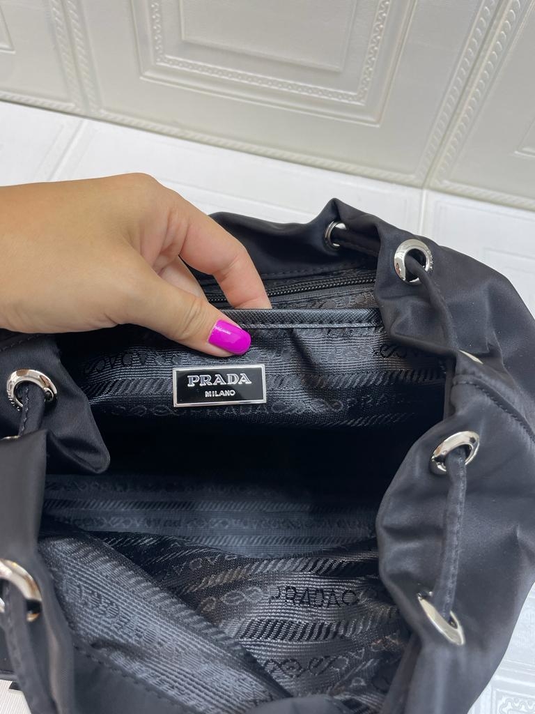 Uma combinação de materiais com charme moderno e atemporal se destaca nesta icônica mochila da marca com base feita em Re-Nylon, uma evolução sustentável do tecido industrial que é uma marca registrada da Prada, e detalhes em couro Saffiano. O logotipo triangular em metal esmaltado, um elemento histórico reinterpretado com charme contemporâneo nos designs a cada temporada, decora a frente.