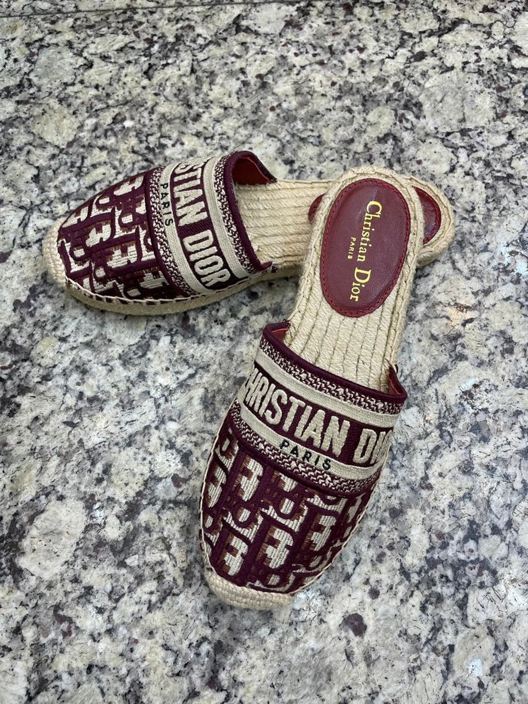 Este mule Dior Granville confeccionado em bordado Dior Oblique vinho. Seu design é adornado com detalhes emblemáticos da Maison, como a inscrição “CHRISTIAN DIOR” no mesmo tom no cabedal, enquanto a sola com corda é feita à mão de acordo com métodos tradicionais. O calçado pode ser combinado com outras criações de malha da coleção Dior Oblique.