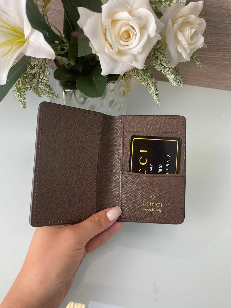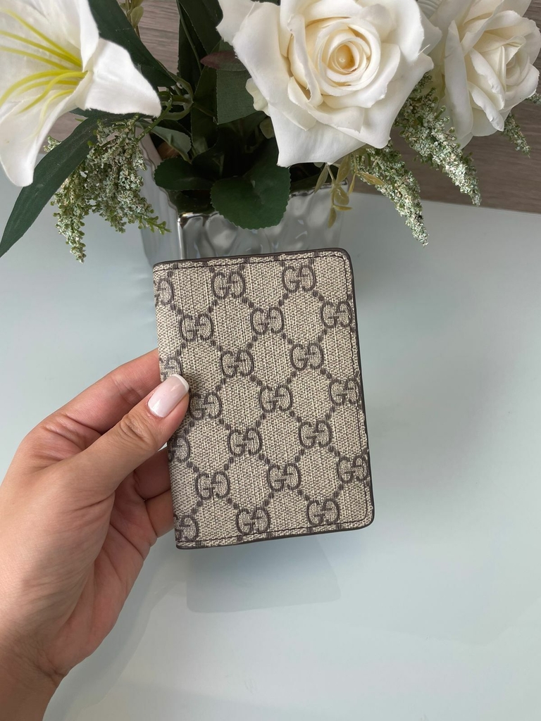 Feita em estampa GG Bege , esta versão do compacto organizador de bolso é ideal para quem quer uma carteira multiuso compacta que possa armazenar cartões de crédito, notas e papéis.