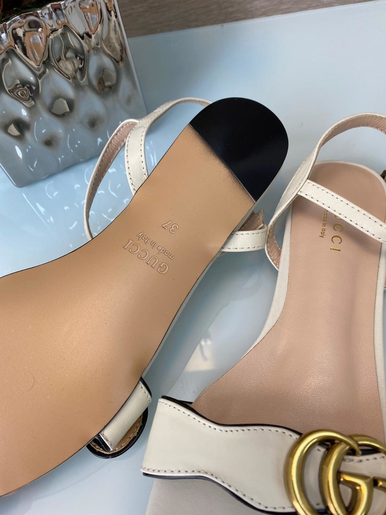 Um emblema da linha GG Marmont, a Double G é uma peça de arquivo da Running G original, uma fivela de cinto que apareceu pela primeira vez nas coleções Gucci nos anos 70. O detalhe em tons de ouro antigo realça um par de sandálias planas de couro branco.